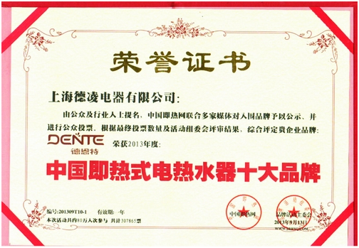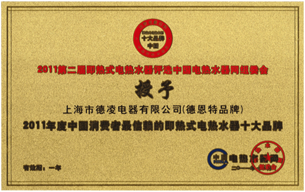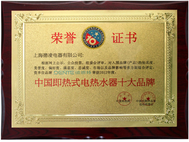 根據網上公示、公眾投票,組委會評審,為入圍品牌(產品)的知名度、美譽度、偏好度、滿意度、忠誠度、市場以及品牌影響等多方面綜合評定,上海德凌電器有限公司品牌德恩特榮獲2012年度中國即熱式電熱水器十大品牌。 【中國即熱網www.jrrsq.com】